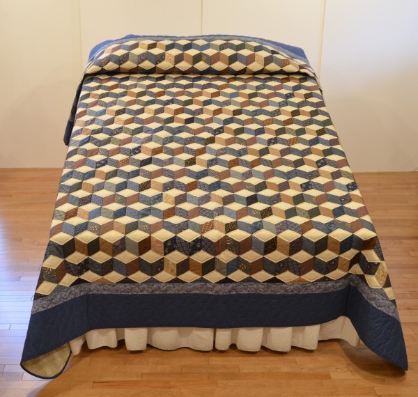 The expert shading in this quilt creates a 3-dimensional effect and the illusion of blocks falling across the bed. The Tumbling Block pattern can only be done well by an experienced seamstress, and the piecing of this traditional design is very precise. Each diamond has discreet hand-quilting all the way around, adding loft and dimension to the design.