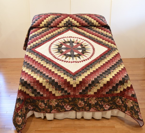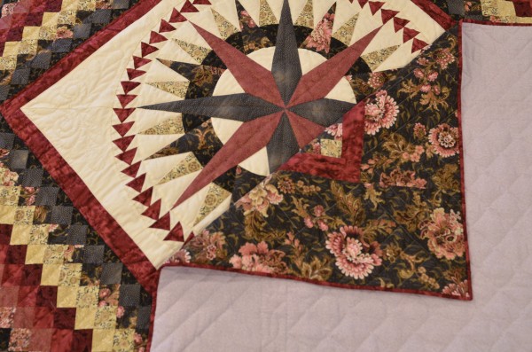 There are three popular quilt patterns in this lesser-known gem. In the center find the Mariner’s Compass star which is encased in a ring of Flying Geese triangles. The quilt’s center block is surrounded by a Trip Around the World block arrangement.