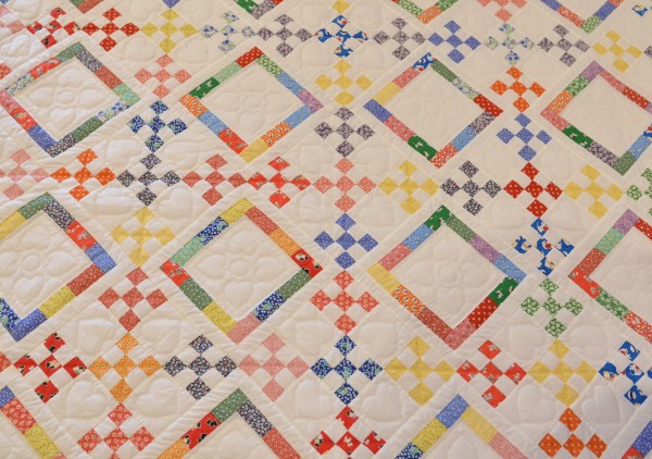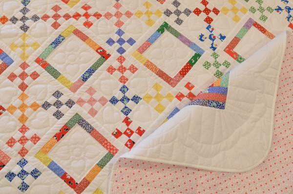 We love how the square rings and checkerboard blocks float on the background. The freight train border is also a nice detail on this visually pleasing quilt.