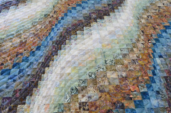 The more than 2,000 blocks are hand-quilted across the diagonal, enhancing the movement of the piece.
