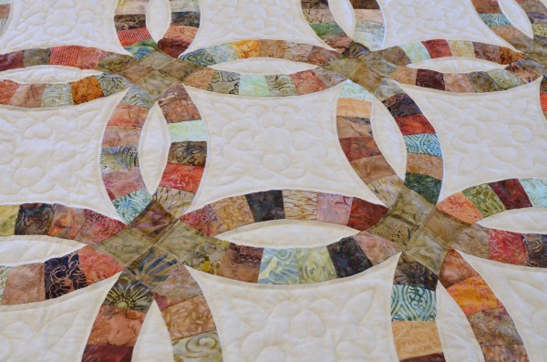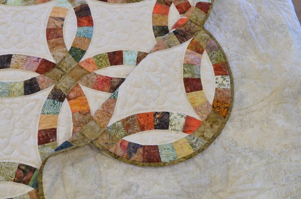 The intertwining circles created from curved pieces of fabric require a skilled seamstress, and the intricate hand-quilting exemplifies outstanding workmanship.