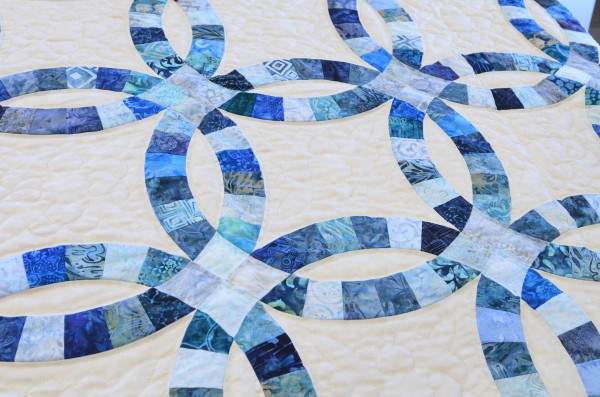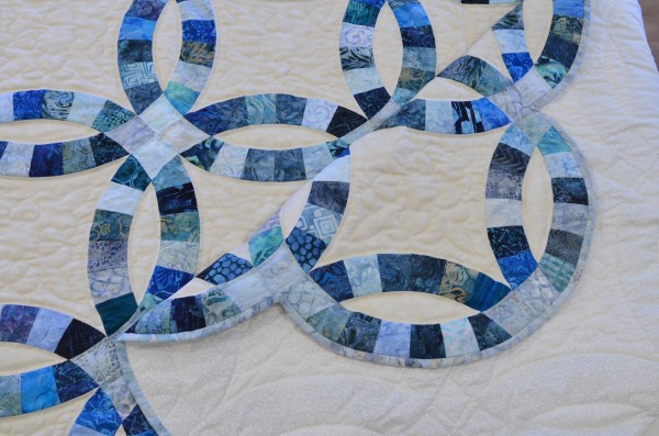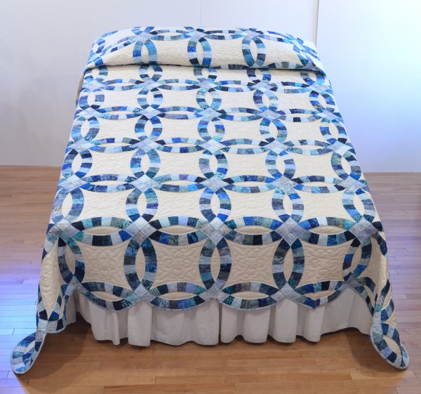 The intertwining circles created from curved pieces of fabric require a skilled seamstress, and the intricate hand-quilting exemplifies outstanding workmanship.