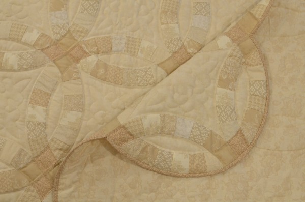 This traditional pattern is an elegant addition to any bedroom and is often gifted as a classic wedding or anniversary gift. The intertwining circles created from curved pieces of fabric require a skilled seamstress, and the intricate hand-quilting exemplifies outstanding workmanship.