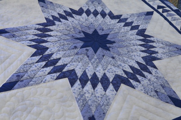 Here’s an attractive variation of the Lone Star quilt design. This smaller star is contained within a Flying Geese border and a pieced block border.