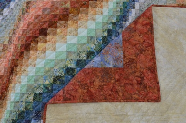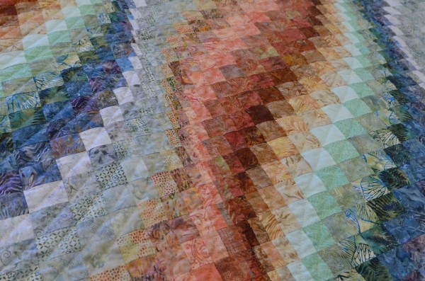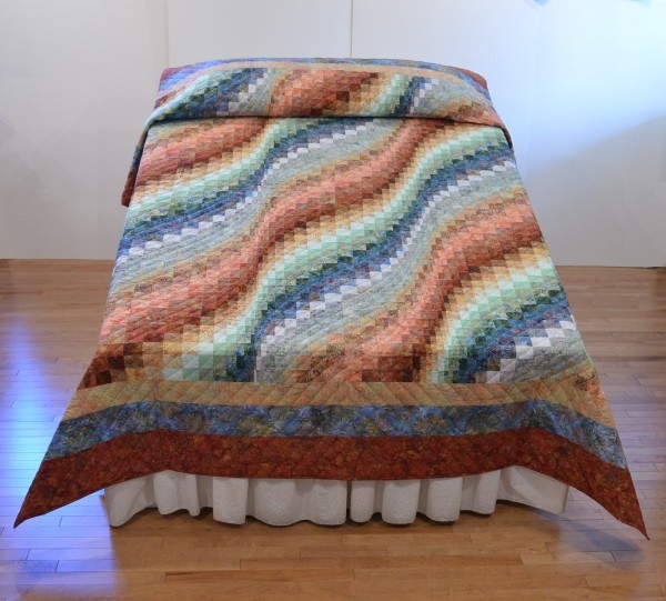 The more than 2,000 blocks are hand-quilted across the diagonal, enhancing the movement of the piece.